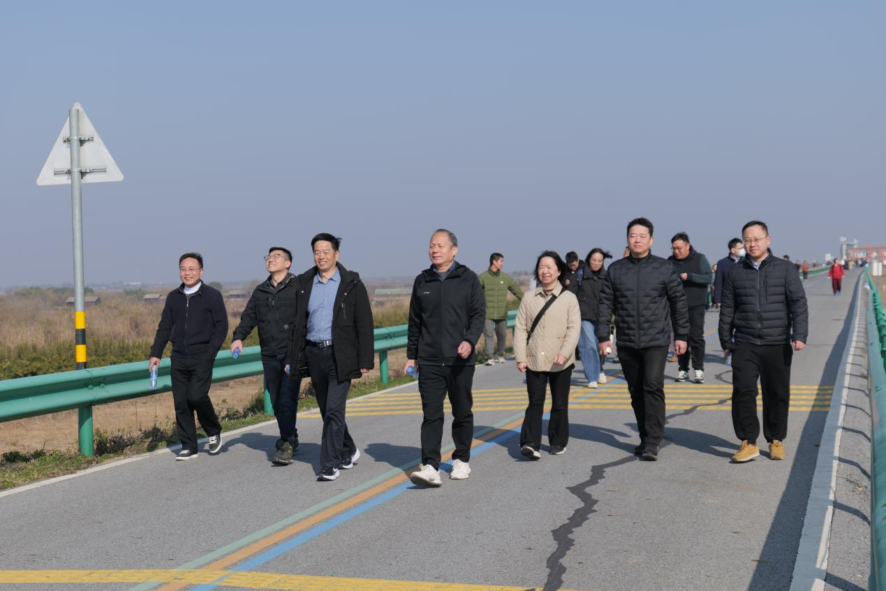 全体人员沿观鹤步道和大堤健步前行,冬日白鹤小镇的怡人风光尽收眼底,一群群白鹤正单脚立于浅滩,雪白羽毛映着波光,宛如水中芙蓉,它们时而低头捕食小鱼,时而振翅掠过水面,划出优雅弧线。行进途中,大家结伴而行、步履铿锵,或畅谈工作心得,或驻足欣赏美景,现场欢声笑语不断,充分展现出我所队伍积极向上、奋勇争先的良好精神风貌。