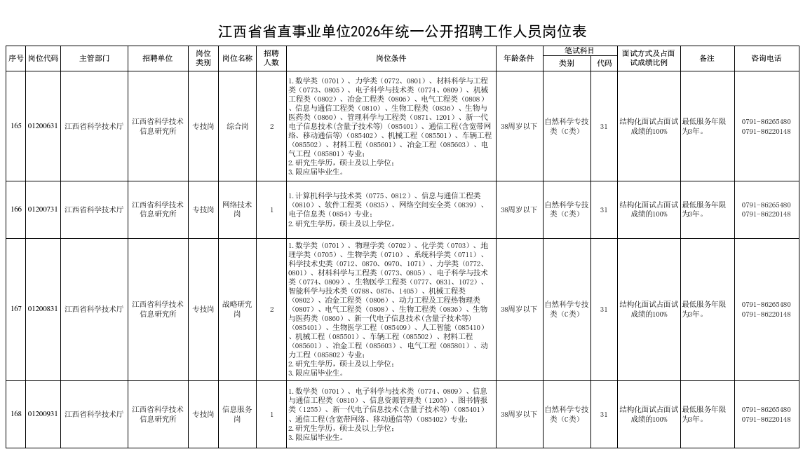 江西省科学技术信息研究所是江西省科技厅直属的公益一类正处级事业单位,属省财政全额补助拨款的省级独立性科研事业单位,加挂“江西省生产力促进中心”牌子。主要开展科技发展战略研究、科技决策咨询公益服务、科技统计分析、科技创新资源及科技文献共享服务、科技成果管理与服务、科技电子政务管理与服务、科技网络信息安全、科技宣传与科普、科技项目管理等科技信息研究和科技管理支撑工作。现面向社会公开招聘专业技术人员6名,有关事项公告如下: