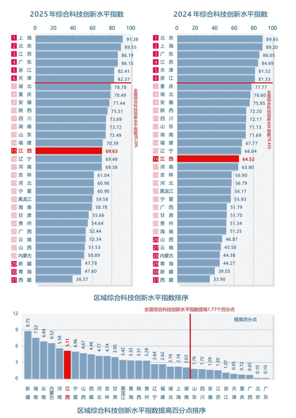 9月21日,中国科技发展战略研究院在浦江创新论坛发布《中国区域科技创新评价报告2025》。报告显示,我省综合科技创新水平指数为69.63%,在全国位次跃升一位至15位比上年提高5.11个百分点,是全国(1.77个百分点)的近3倍,增幅居全国第六。
