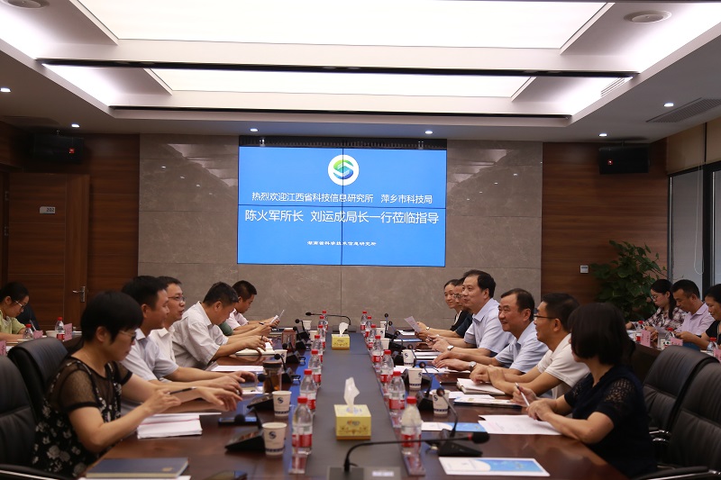 8月7日,为加强赣湘科技交流合作,推动科技创新资源共享、产业优势互补,江西省科技信息研究所陈火军所长、萍乡市科技局刘运成局长联合组队,赴湖南省科技信息研究所开展调研学习活动。湖南省信息所党委书记、所长周斌、副所长许明金、匡建斌会见了陈所长一行。江西省信息所李长禄副所长(正处级)、高燕副所长、萍乡市科技局彭春涛副局长参加相关活动。