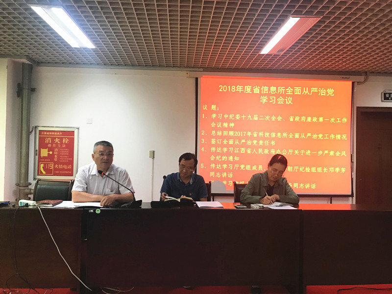 2018年5月4日下午,省信息(情报)所党委组织全体党员干部在所三楼会议室召开全面从严治党学习会议。会议由党委书记柳俊君主持,所长陈火军、副所长黄虹以及全所党员干部、预备党员、入党积极分子共40余人参加会议。