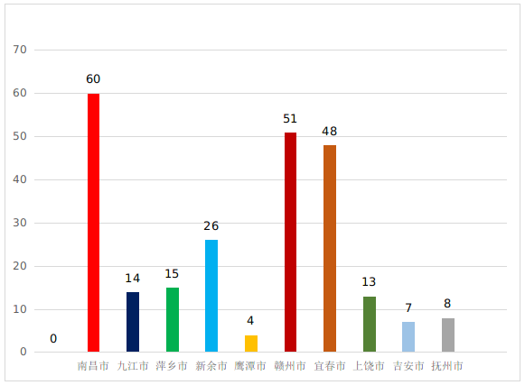 从设区市登记情况来看,南昌市60项、赣州市51项、宜春市48项、新余市26项、萍乡市15项、九江市14项、上饶市13项、抚州市8项、吉安市7项、鹰潭市4项(见图1)。