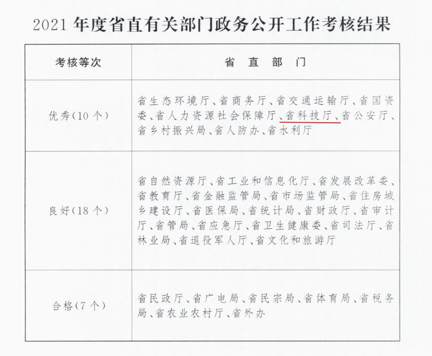 近期,江西省人民政府办公厅下发《江西省人民政府办公厅关于2021年度全省政务公开工作考核情况的通报》。由我所承担的厅门户政务公开工作勇创佳绩,在本次考核中江西省科学技术厅考核等次为优秀。